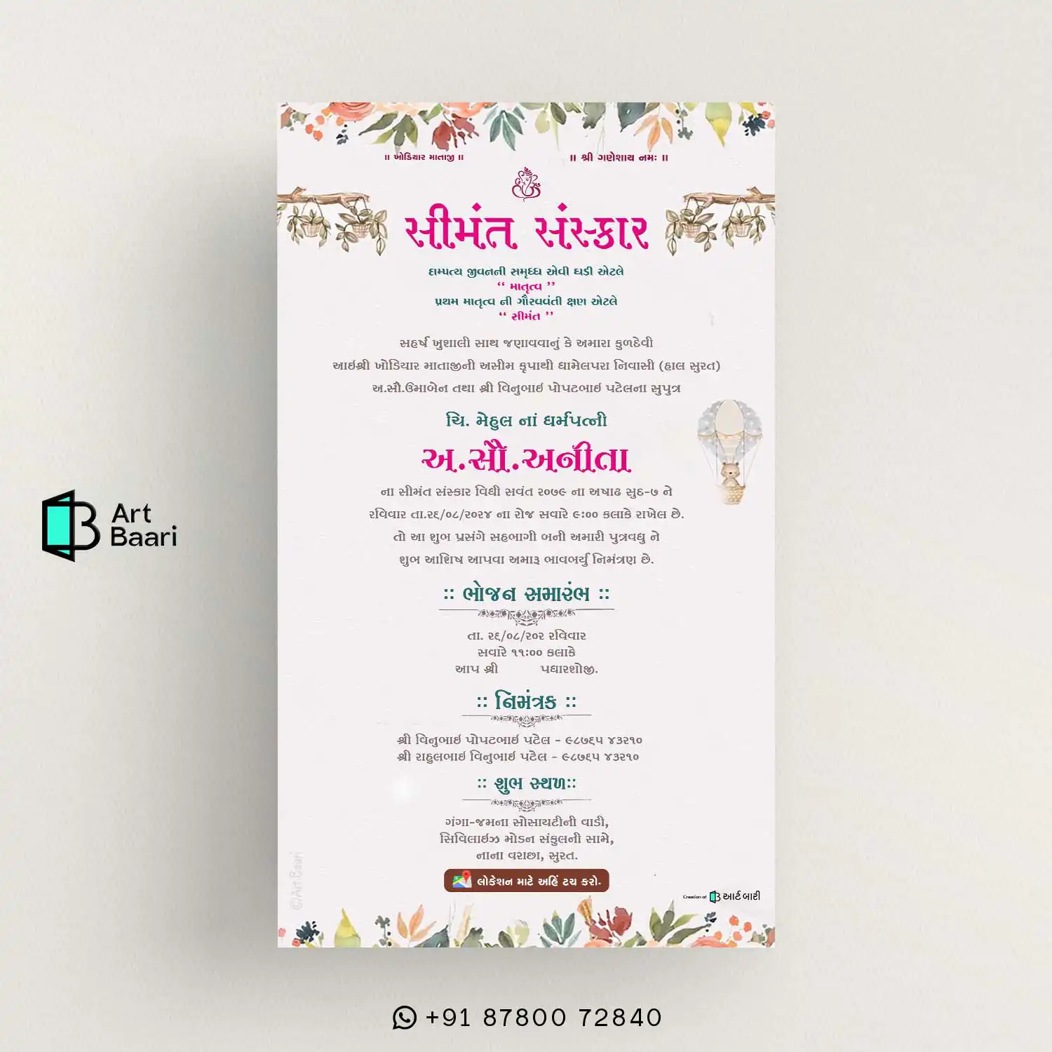 Simant Vidhi Invitation Gujarati || Best Baby Shower Card || Digital E Invite || Teddy Balloons With Modern Satyle – BSG40046