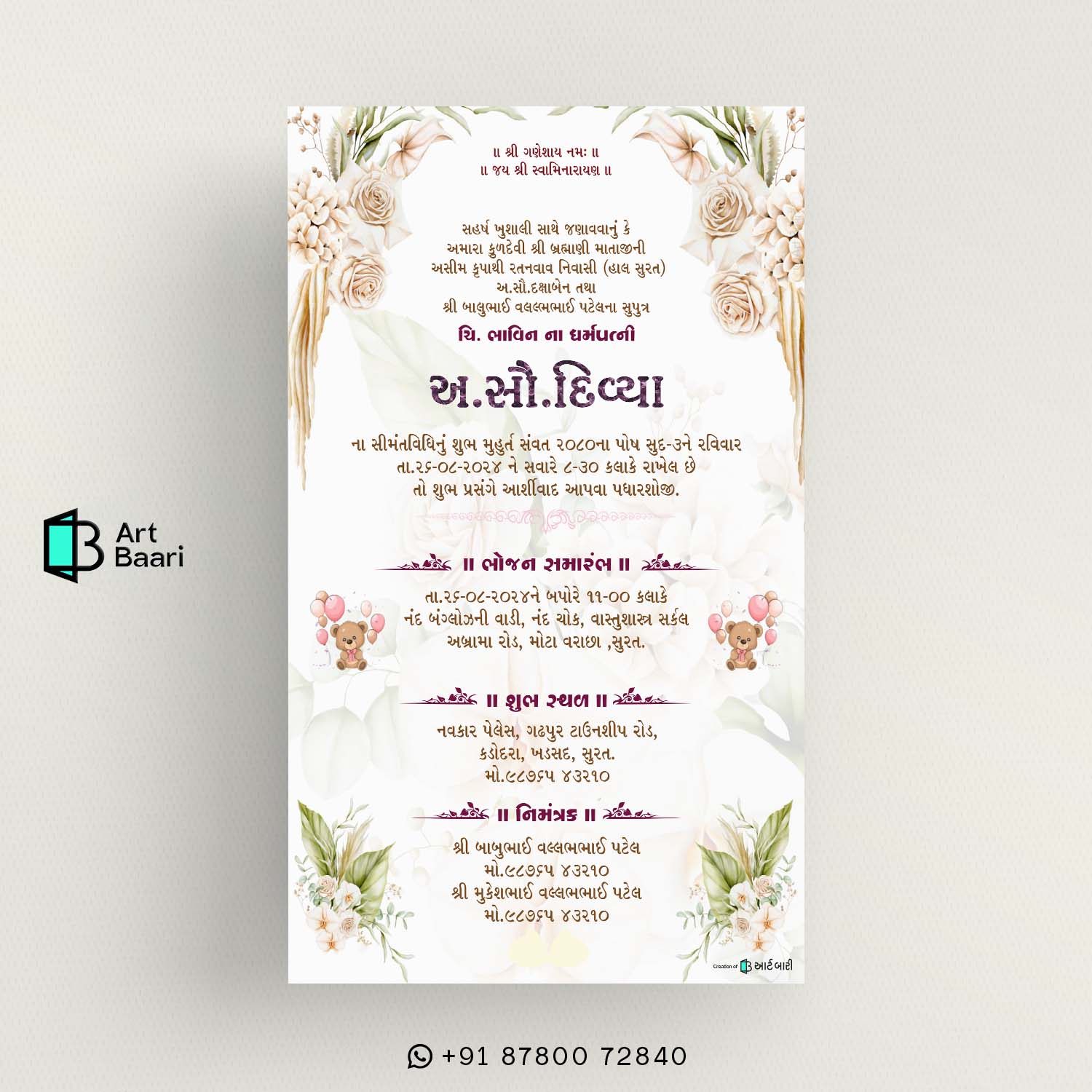Simant Vidhi Invitation Gujarati || Best Baby Shower Card || Digital E Invite || Teddy Balloons With Modern Satyle – BSG40046